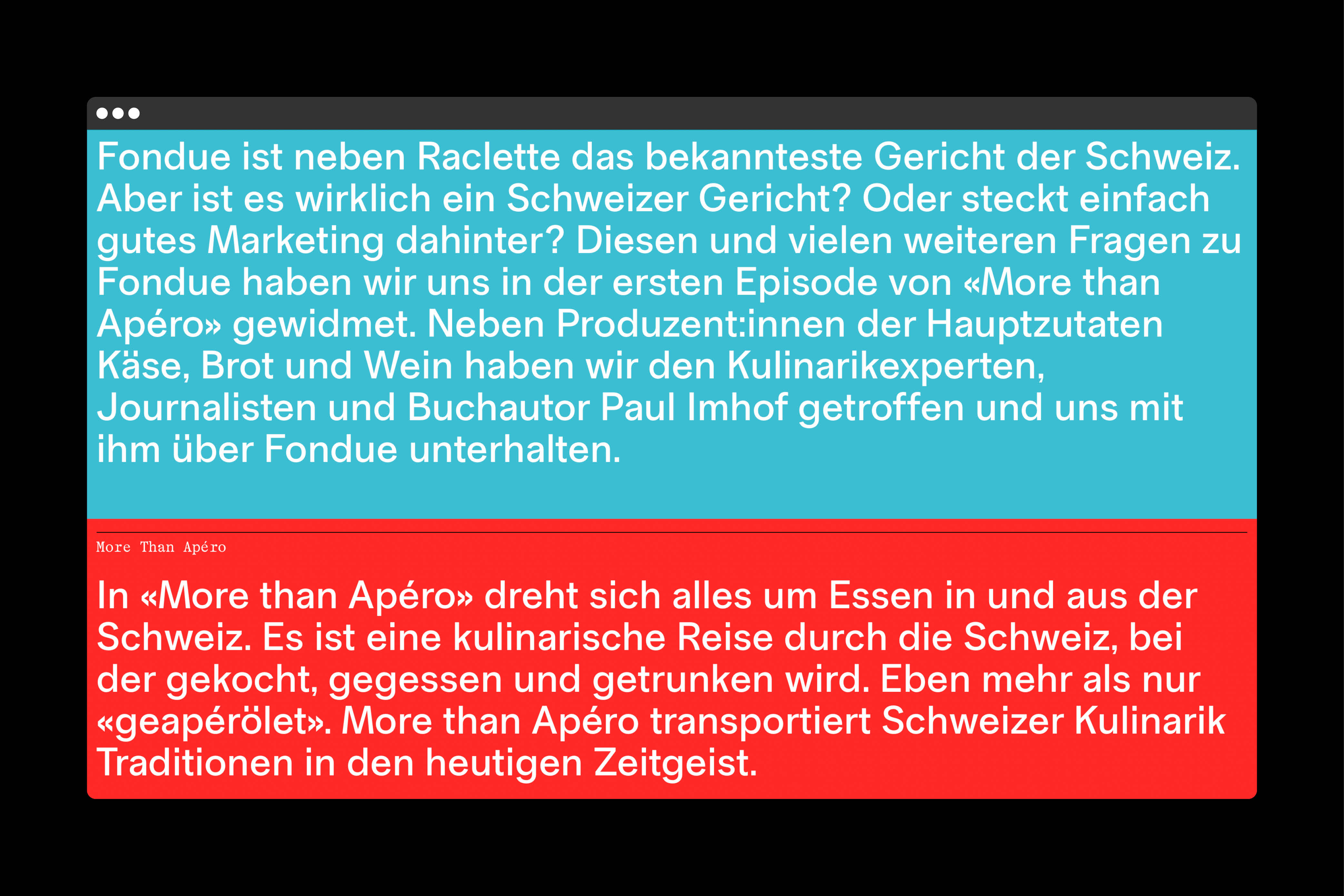 More than Apéro is all about celebrating food from and within Switzerland. It takes you on a delightful culinary journey across the country, where people come together to cook, eat, and drink. More than Apéro brings Swiss culinary traditions into today’s zeitgeist, blending timeless flavors with modern twists to create a vibrant and tasty experience for everyone.